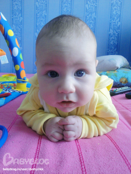 Теперь понимаю как это - растет не по дням, а по часам!!! Кажется только недавно попали домой с роддома, а он уже такой большой)))) Пытается ползти, подтягивает ножки к животику, оттопыривает попу и хочется ползти, а что ручками надо тоже работать ещё не догадался)))) Режутся зубки сверху, стал капризный, ночью часто просыпается и хнычет, все в рот тянет и грызет прям со злостью, скорей бы они вылезли! Начали кушать картофельное пюре, не могу сказать, что он в восторге, но ест, а яблочко мы обожаем) Вчера заливался смехом, когда ему говоришь "БББЭ", смеялся, а потом повторил))))) И в тоже время научился плеваться, губки в трубочку и со звуком "БУ" или "ППУ" плюется и сам счастливый от этого, так весь вечер и проплевал