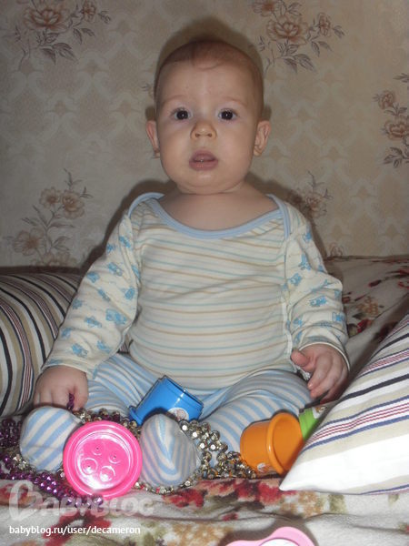 Так хорошо, уверенно сидит, молодец малыш. Такая у него улыбка замечательная.