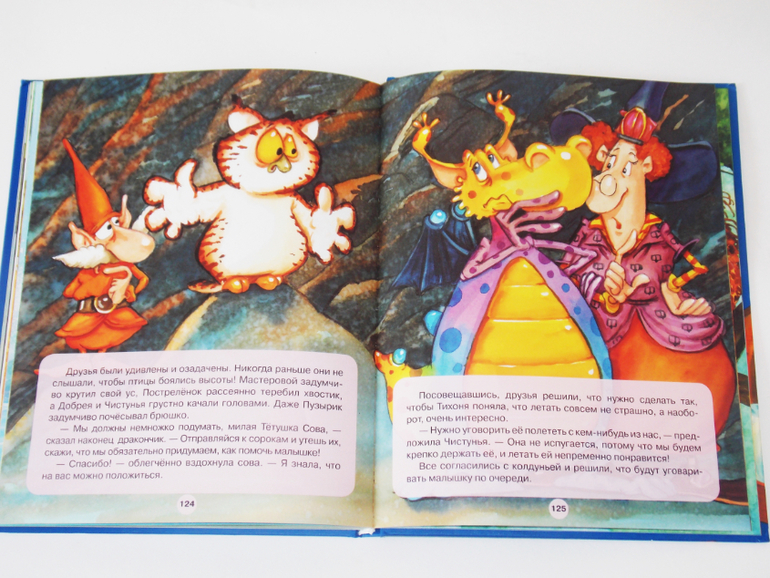 Книга качественная, хорошая бумага, яркие и, на мой взгляд, добрые иллюстрации. Кроме Пузырика мы познакомимся с такими героями как:фея Добрея,домовой Мастеровой,чертенок Постреленок,гном Чищу-дом,колдунья Чистунья.