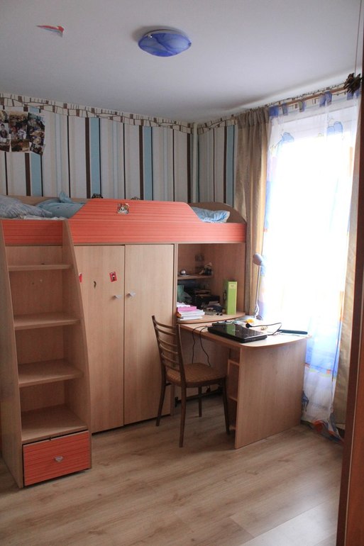 Размеры: ширина: 1932 мм, глубина: 1196 мм, высота: 1650 мм Материал: ЛДСП 16 мм (Австрия, Egger). Кромка покрыта ПВХ толщиной 0,4 мм, радиусные детали покрыты кромкой толщиной 2мм. Цвет: корпус - бук, фасад - ольха, оранжевый . Основание под матрац: ДСП. Сборка универсальная, лестницу можно установить на любую сторону. Характеристики: • высота бортика кровати 300 мм; • боковой шкаф состоит из полок, нижнее отделение с дверцами. Размеры бокового шкафа: Ш840хВ1300хГ450 мм; • в среднем шкафу располагаются полки и штанга для одежды. Размеры среднего шкафа: Ш740хВ1300хГ840 мм; • стол выкатной на колесных опорах. Рабочее место выкатного стола: 850х700 мм; • размеры лестницы: Ш400хГ350хВ1280 мм. Лестница имеет выдвижной ящик глубиной 300 мм, установленный на шариковых направляющих. Размер спального места, см: 80 х 190.