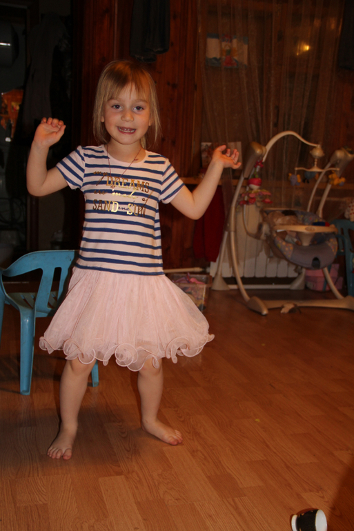 перед глазами, а мы всё неопределимся чем заняться, куда податься. Фе закончил учебу в школе, весьма неплохо:четыре тройки, алгебра и геометрия не его "конёк", английский и физика тоже тройки, русский язык исправил, я рада. Теперь он не знает чем бы ему заняться. В лагерь категорически не желает, к бабушке на дачу тоже, со мной и сестрами тоже не хочет ехать, правда, мы еще толком не определились куда и когда, но тем не менее. Я предложила ему с папой остаться и помогать в работе, вроде он согласен, но не все 3 месяца лета...короче, думает он. Мне огород надоел, посадила тыкву и кабачки и еще "по-мелочи", но пропалывать и поливать неохота. Дети радуются наступившим жарким дням, целыми днями на улице, бывает, что и покушать забывают так заигрываются. К Насте это не относится, она всегда хочет есть, даже если только что покушала, но видит кого- то с едой в руках или тарелкой, бежит туда и требует еды. Вчера были у остеопата с ней, сказал, что летом надо появится раза три...ммм, не знаю, не уверена, что получится, всё таки я хочу куда-нить уехать отдыхать.Ну посмотрим. Дуне купили новое платье и теперь она даже спать в нём ложится, ахах.