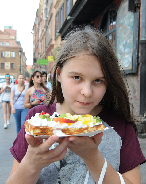 Вкусняшка! Вафля, на ней взбитые сливки и разные фрукты. Стоит 7 евро.