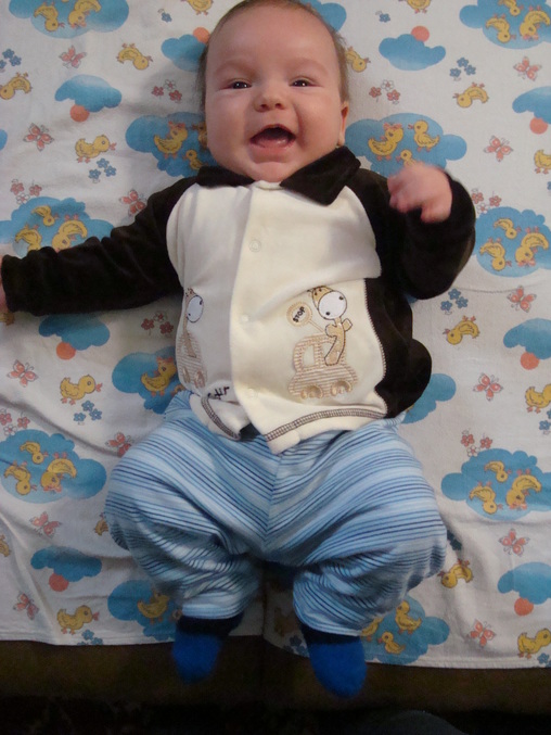 Научился переворачиваться – теперь это делает быстро и все время. Порой невозможно сменить подгузник. Спит, как взрослый – на боку или животе. Поза «жабки» канула в небытие. Сам берет игрушки, тарахтит, лепечет на своем эльфийском. Пытается ползти, но ноги в коленях сгибать не умеет и очень психует. Неадекватно реагирует на темно-синию упаковку салфеток. Прямо пищит от восторга.