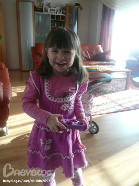 Это на сл день после дня рождения. уже с подарком от родителей мужа ))) Так она обычно дома одевается. Та еще модница. Каждый день платья новые выбирает....У нас их штук 10 наверное...