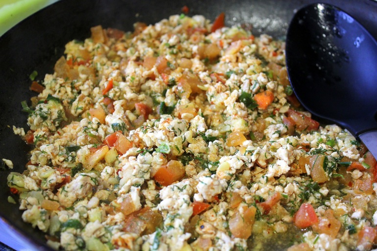 Мякоть кабачка мелко нарезать. Выложить на сковородку. Нарезать мелко помидор. Добавить к мякоти кабачка. Туда же положить фарш. Потушить всё до полу готовности.