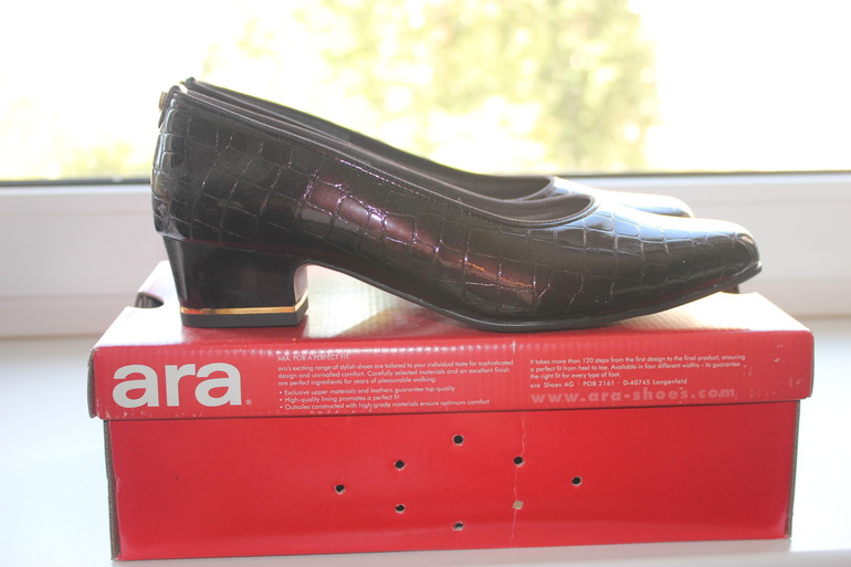 Продам абсолютно новые туфли немецкой фирмы "ara". Размер 40, по стельке примерно 26,5, подойдут и на широкую ногу.Каблук 4 см. Цвет черно-коричневый, лаковая кожа.