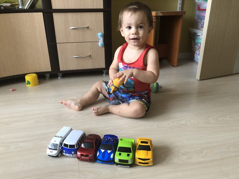 Строит башни из кубиков и не только из них. В ход идёт всё подряд, что можно уложить друг на дружку! Построит и хлопает в ладоши. Все присутствующие обязаны тоже похлопать! А потом ба-бах! Одних его взмахом руки башня превращается в руины. А радости-то у ребёнка при этом!!! Выстраивает машинки в ряд (сам придумал). По-прежнему обожает мячики, играет в футбол.