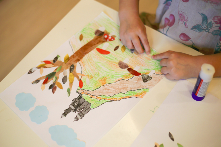 Любит она это дело. Даже терпения хватает посидеть :))) Даю заготовки для аппликации, клей и рекомендации (типа "пару листиков можно и под дерево на травку положить").