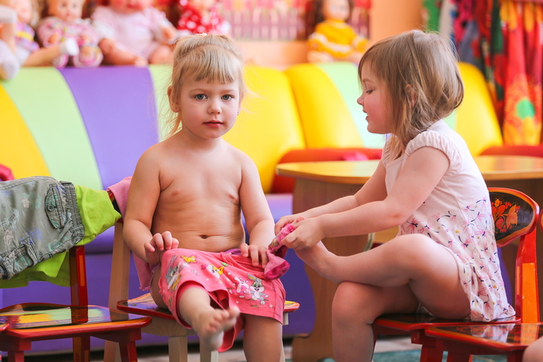 Кажется, появилась у нашей дочки первая настоящая подружка - Василиса. Утром всегда бежит к ней с криком "Ва-си-ли-и-и-са-а-а!!!" и бросается обниматься. Характер у обеих примерно одинаковый - из разряда "ураган в юбке" :))) Вот они - одеваются после тихого часа: