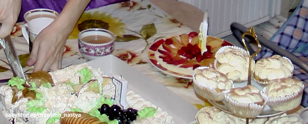 Торт заранее заказать не успели. Но на субботу, когда будем отмечать ДР с родственниками, заказ сделали.Я пекла свои любимые капкейки «Тирамису». Мы их выкладывали на трехъярусную горку, правда сфотографировать забыли (все же первый ярус попал в кадр).