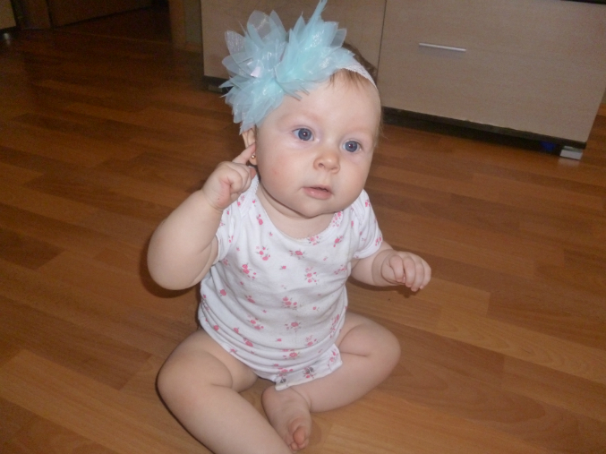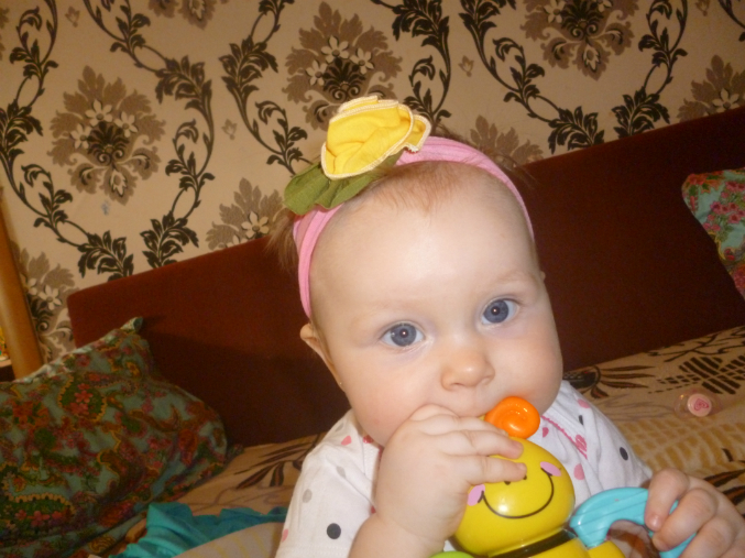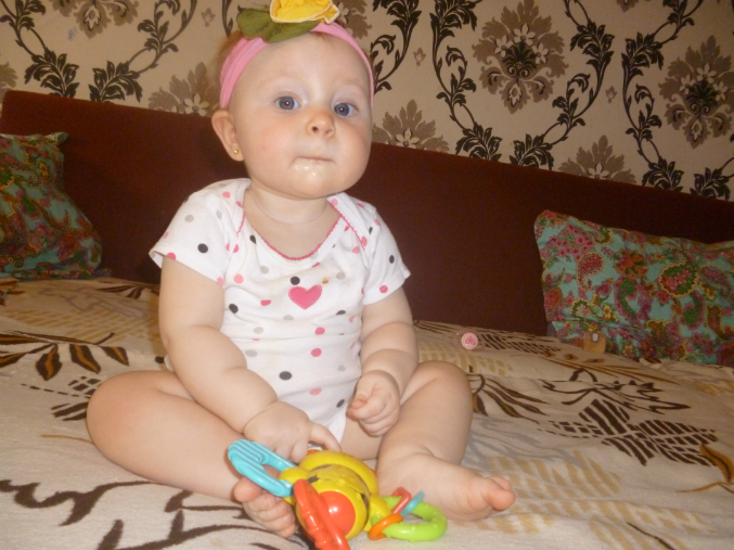 Со вчерашнего дня играет в "ку-ку", двумя руками берет полотенце, закрывается, а когда говоришь "где Варечка?" открывается и хохочет. Встает около дивана, ходит около него, держась одной рукой, но делает это ооочень осторожно, медленно. Пугливая моя