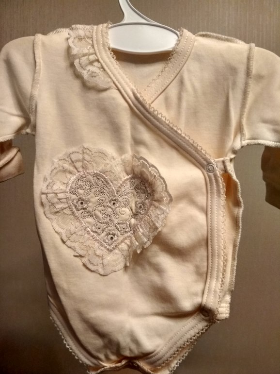 Очень красивый боди от фирмы Лео цвет кремовый. Отстрочка из кружев, сердечко из кружева со стразами. Швы наружу. Размер 56. Вещь новая. Покупали как дополнительный на выписку, но не пригодилось, использовали другой.
