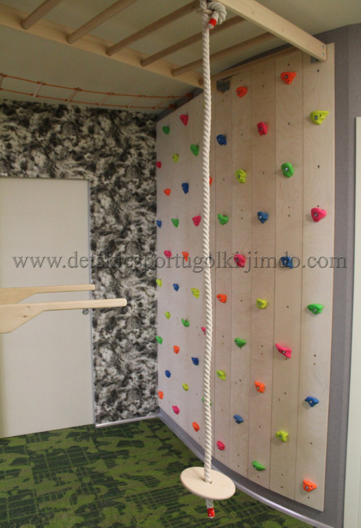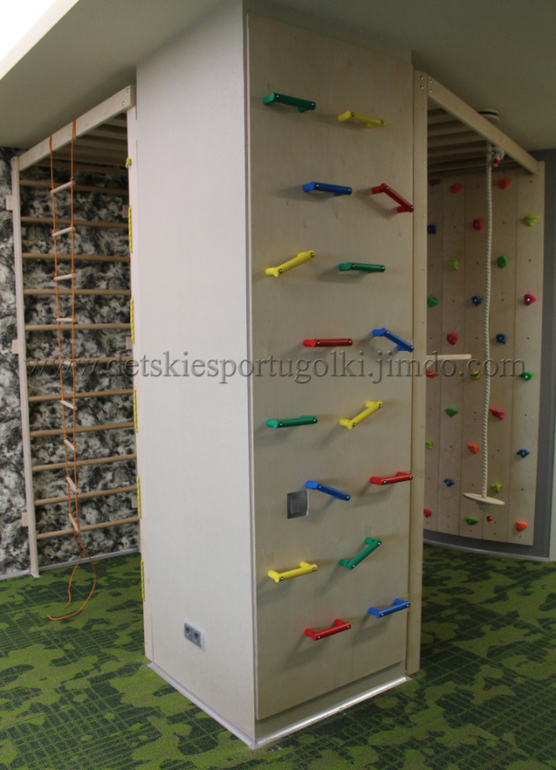В "Гостиной" - скалодром на закругленной стене, шведка+гладиаторская сетка+панель с ручками, расположенные на разных сторонах колонны, а также два рукохода под потолком, соединяющие скалодром и шведку с колонной.