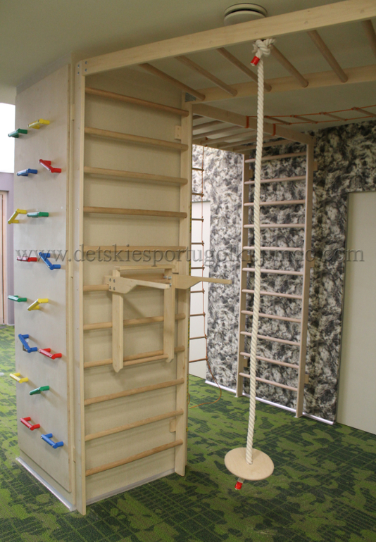 В "Детской" - двухэтажный спортивный комплекс с просторной площадкой 200/125см, пожарным шестом, люком, стационарным турником и разнообразным навесным оборудованием, которое крепится на рукоход под площадкой.