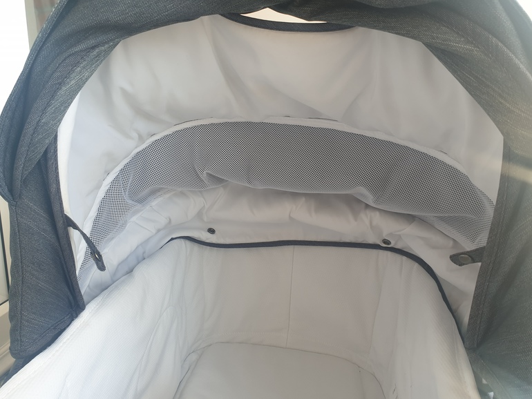- Предусмотренная вставка из «дышащей» сетки в капюшоне позволяет усилить циркуляцию воздуха внутри люльки и открывает дополнительный обзор на ребенка