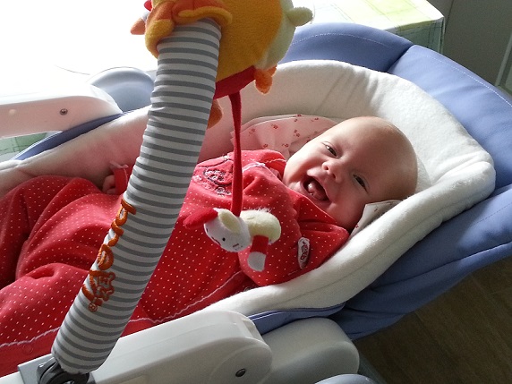 Сегодня научились переворачиваться с животика на спинку, правда потом плачем, так как обратно не можем, а на спине лежать надоело. :) Вообще заметила, что Лика стала все больше интереса к окружению проявлять, поиграет полчаса с погремушками, подубасит их, а потом носи её показывай все. Особенно интересны магниты на холодильнике, может их рассматривать, пока у мамы спина не отвалиться.))