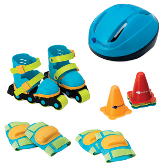 Роликовые коньки с колесами в линию, с 4 положениями для адаптации к размеру ребенка, а также наколенники, налокотники и сертифицированный защитный шлем. В набор также входят 4 конуса для разметки. Храни все это в симпатичном рюкзачке!