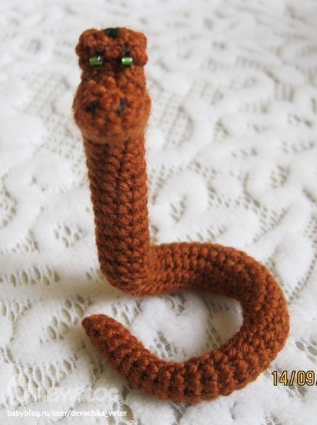Связалась у меня такая вот змейка. Длина 17 см. Крючок. Глазки - бисер. Вязала без описания.