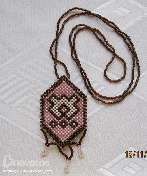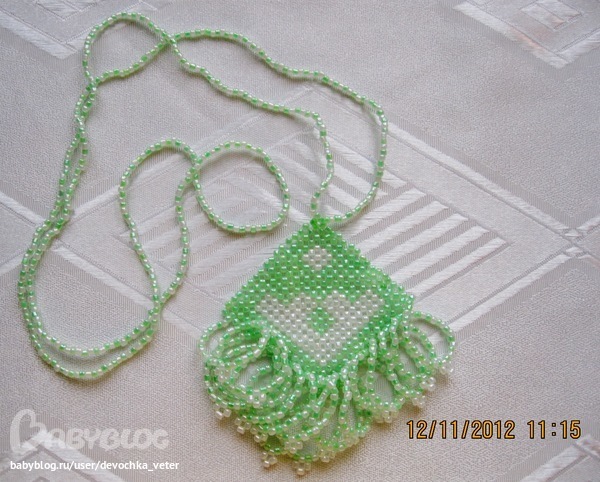 Выполнена крючком, украшения из бисера. Высота 14 см. Цена 350 руб.