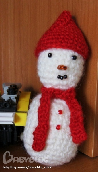 Связался снеговичок, которого уже конфисковали:). Выполнен крючком. Рост примерно 10 см. Глазки, носик, рот и пуговицы из бисера. Вязала без описания.