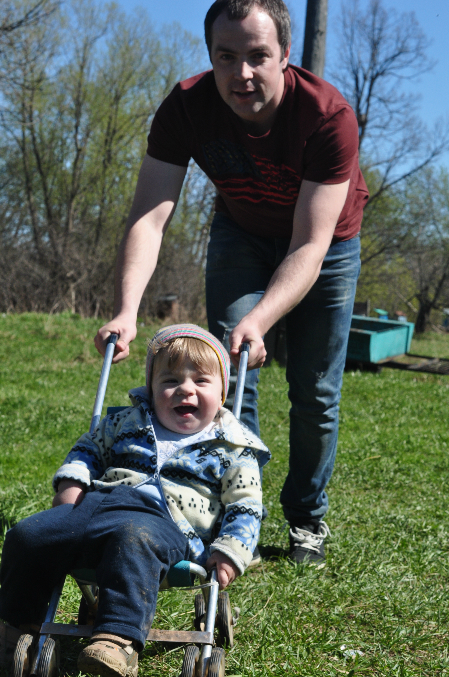 Папка катает на кукольной коляске :)) Коляска советская - сделана на совесть:))