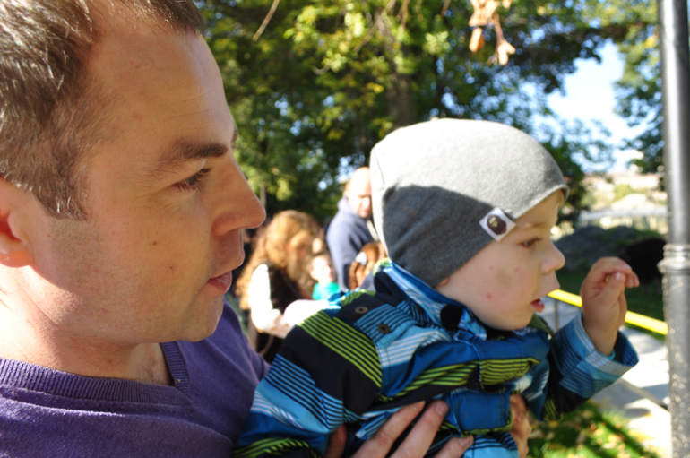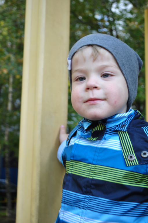 в коляске со мной)))) один раз в Сокольниках в кадр попал, когда муж его вез