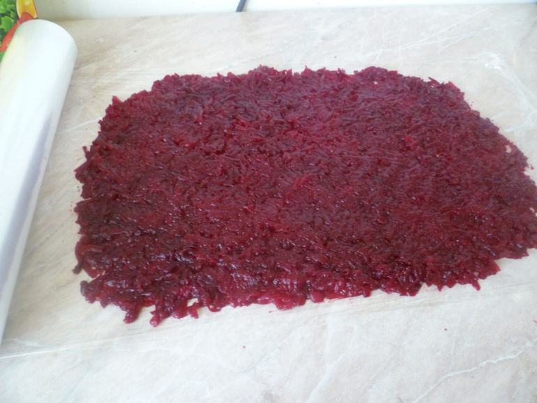 На пленку раскладываем натертую свеклу