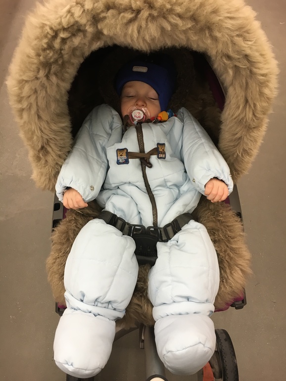 Приходится греть машину, выбегать с автокреслом, в которым Лев в свитре и джинсах и в флисовом толстом одеяле.