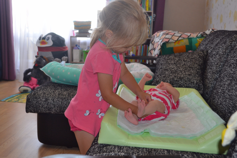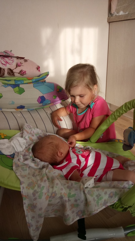 и началась наша веселая жизнь большой семьей)))) первый день Алина разрывалась между Машей, своими забытыми игрушками и новым велосипедом. она и соску пыталась в Машу впихнуть, и все тапочки, пинетки на Машу одеть перемерить, и подгуз застегнуть, и бодик помочь одеть - застегнуть все кнопочки))) коляску покатать)