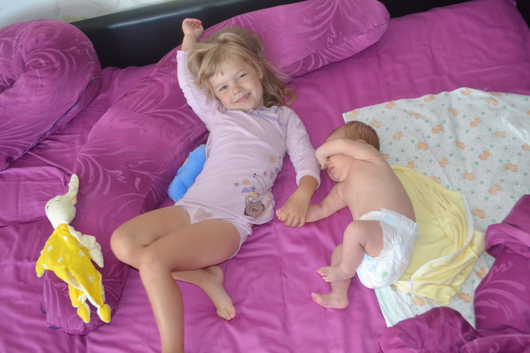провожаю Диму на работу в 7.30, и пошло "мое время" - умыться, помыться, позавтракать в тишине, посидеть за компом) все что хочешь)))) часов в 9-9.30 просыпается Алина, в это время Маха обычно кушает - кладу ее сразу а диване,зовем Алинку к себе и мы дружно втроем валяемся) Маха досыпает, Алинка обнимается) когда Маша просыпается, открываем шторы, и пока я варю Алине кашу, девчонки потягушничают вдвоем))) в такие моменты нежность зашкаливает) Алине надо самой расстегнуть Маше пеленку-кокон, сказать какие потягушки Маша устроила))))и за руку Машу подержать, обнять, лежать рядышком)))