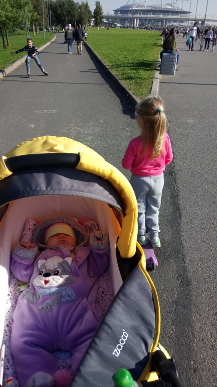 спали все как сурки!) Алина проснулась пол 10, я кое-как заставила себя тоже встать) Мари проспала до 11!) глядя на улицу Алина сказала " а давай в парк погулять сходим!?" а почему бы и нет?!) собрались и пошли!) в наш, в 300-летия) втроем) одна в коляске, вторая на самокате, третья пешком, и таща всех и всё)))
