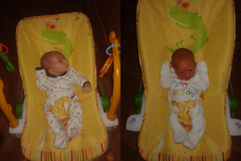 Научились подольше лежать на животике, даже спит иногда так. Хотя любимая поза: лицом к миру, чтоб мама носила на ручках и подольше так по всему дома носить и кружить надо.