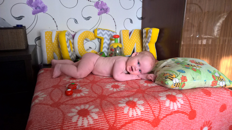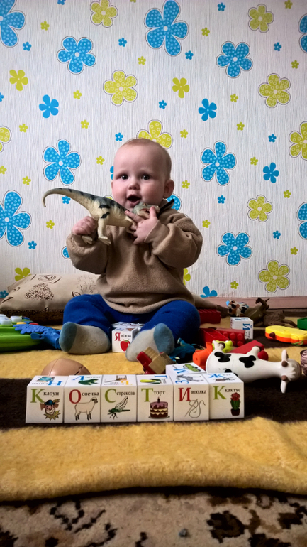 Из физических возможностей): научился переворачиваться обратно с живота на спину. Крутится во все стороны как колбаска). На животе вокруг своей оси. Но не ползает. Начал хоть немного пытаться стать на коленки. Но пока только пытаться. Сидит ровно, не падает, не заваливается. Но сам не садится. По-прежнему любит стоять.