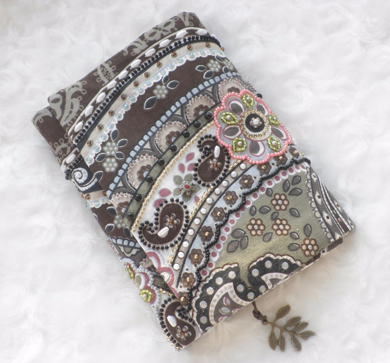 Софтик размером А5 (по-моему, самый удобный формат для блокнота), странички, тонированные кофе,и хлопковая "шкурка", расшитая бисером по рисунку ткани))