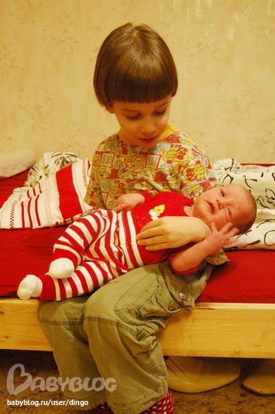 Тома стала больше "гулять", кормится почти всегда с открытыми глазами (теперь как-то неудобно стало под этим взглядом читать во время кормления или сидеть чай пить :) Начала смотреть более сфокусировано, настраивается быстрее, переводит взгляд, следя за чьим-нибудь лицом, ищет глазами источник голоса. Почти каждый день непременно "тусуется" вечером с мальчиками на кровати, они валяются вокруг нее, трясут ее игрушками, просто смотрят и трогают.