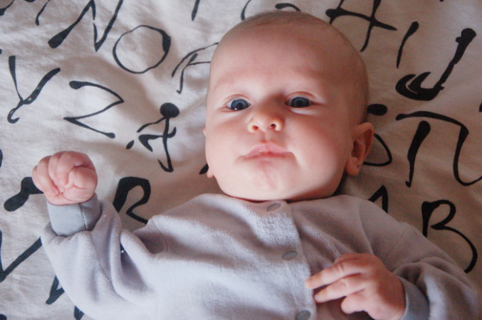 А еще на этой неделе Томик стала хватать и сжимать в кулак все, что попадется - одежду, одеяла, ну и воспользовавшись этим, мы стали вставлять ей в ухват погремушки.
