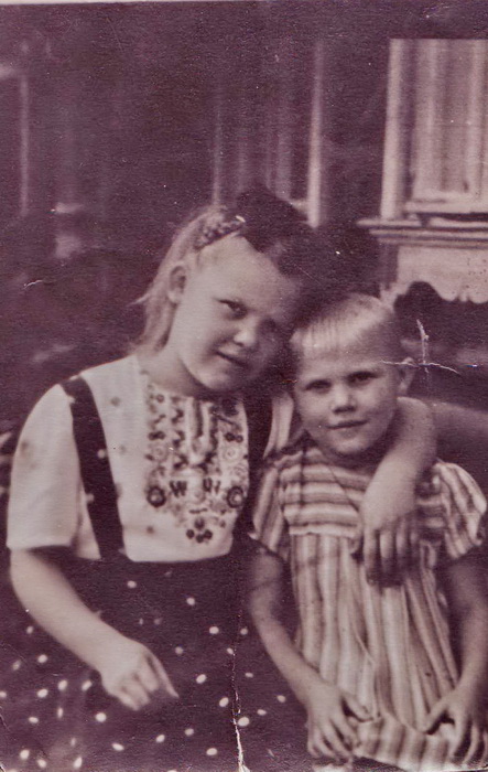 Помнит как уже после войны пошла в школу старшая сестра Валя, а потом и сама бабуля (уже в 47-м), писали сначала на газетах, а потом выдавали по одной тетрадке, потерять или испортить которую было нельзя, другую не давали, пока не принесешь полностью исписанную первую. На фото бабушка с сестрой как раз после войны, бабуле около шести, её Вале сестре девять.