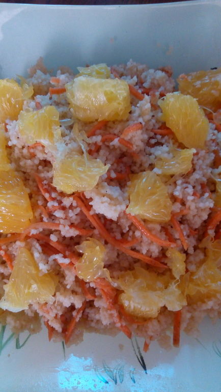 100 г кускуса высыпаем в миску, добавляем столовую ложку растительного масла и втираем в кускус, затем заливаем 170 мл кипятка, минут через пять рыхлим вилкой, жидкость впиталась, добавляем морковь маринаде и апельсины.