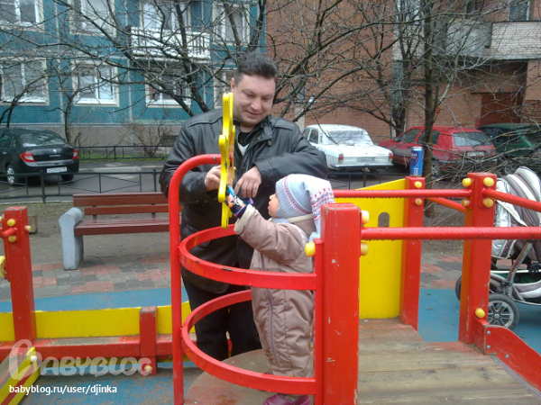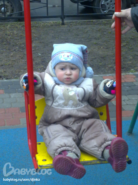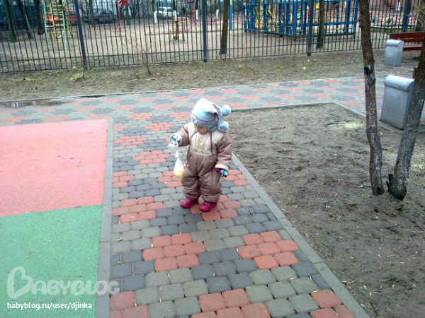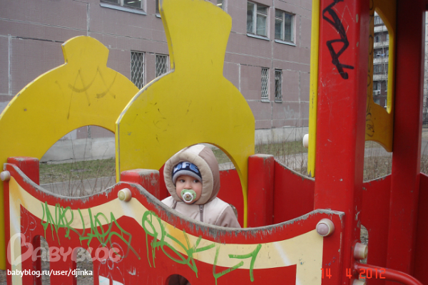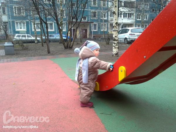 Вот мы уже уверенно ходим по детской площадке и активно общаемся с детками в песочнице, нас всё время тянет на горку, только одного пока не пускаю, вот немнго фоток