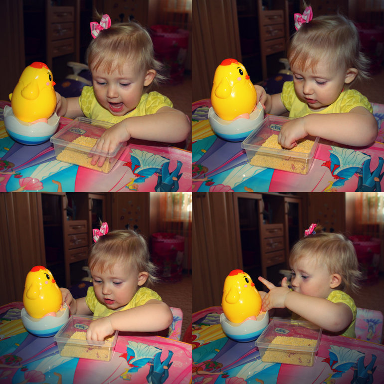 Настоящий восторг у неё вызвал стишок и цыплёнок с яйцом.Вот тут то у меня получилось заснять нереальные живые эмоции))Она так радовалась,когда вместо яичка появился цыплёнок)