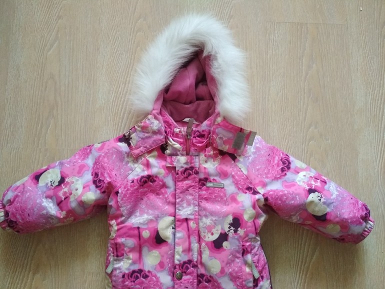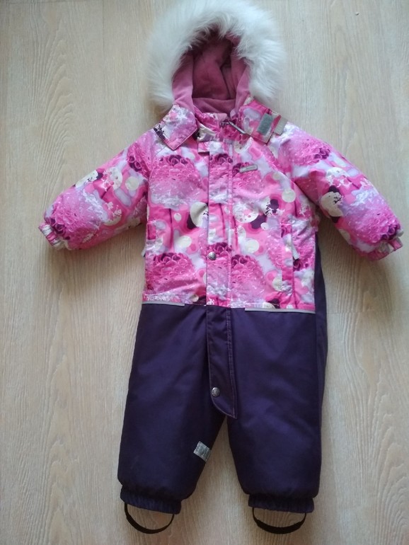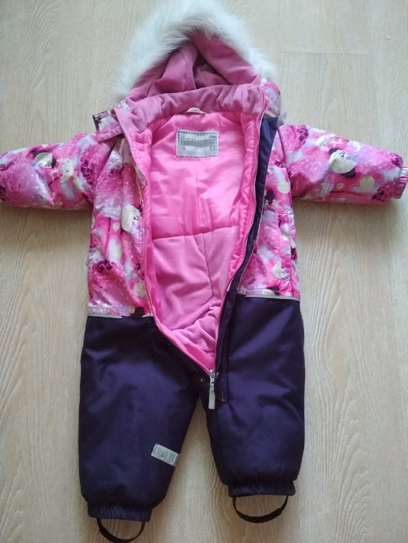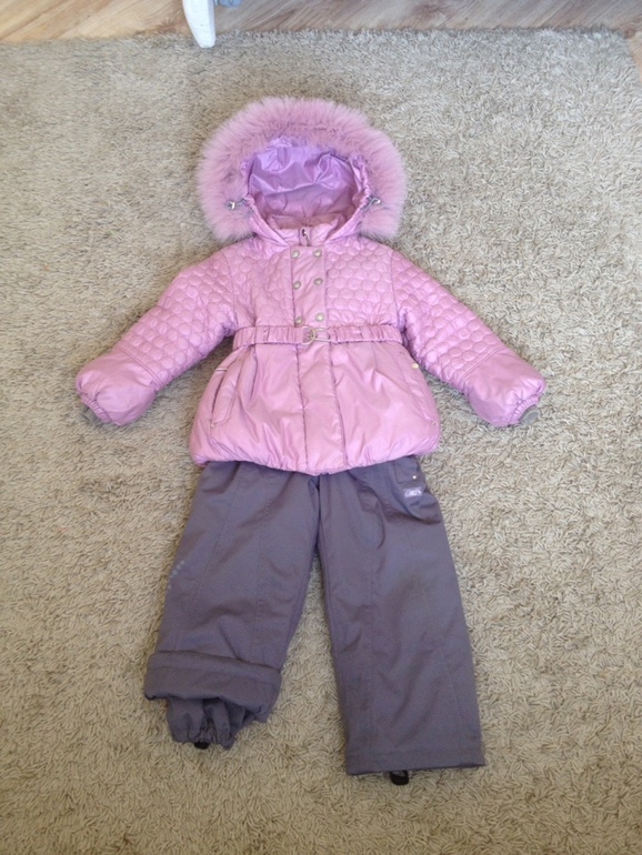 рр 92, новый. Мы переросли, так и не надев. очень теплый, качественный. Красивый. Под него есть новая черная шапка туту с натуральным помпоном. Опушка на комбезе - натуралка.