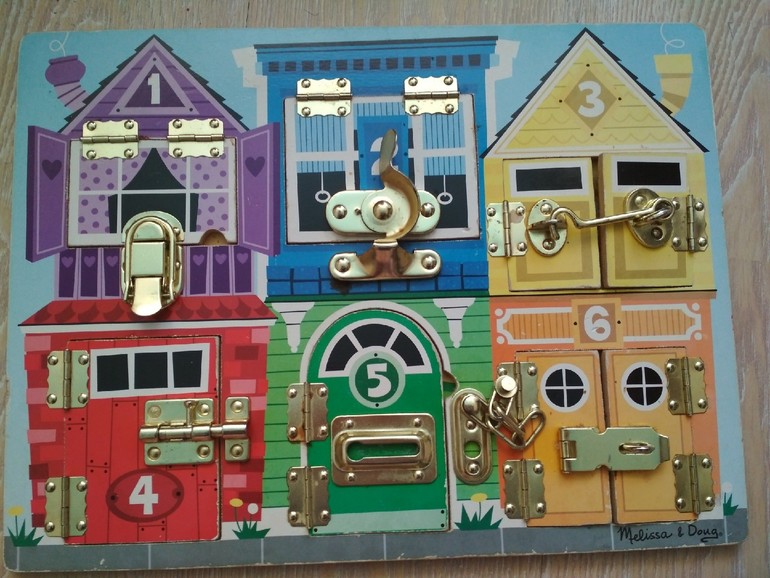 Все дети очень любят открывать и закрывать разные задвижки и крючочки, а на деревянной доске Melissa&Doug 6 закрытых дверей. За каждой из дверей малыша ждёт небольшая интересная картинка-сюрприз. Есть ради чего повозиться! Крючочки и задвижки металлические, блестящие, привлекательны для малышей. Каждая из дверей пронумерована, а за ней то количество персонажей, которое на ней написано, то есть малыш может попутно изучать цифры и устный счёт. Игра не только отвлекает ребёнка от настоящих дверей, она развивает мелкую моторику малыша, логическое мышление, память. Прекрасная стимуляция любознательности и очень интересная "головоломка" для ребёнка!