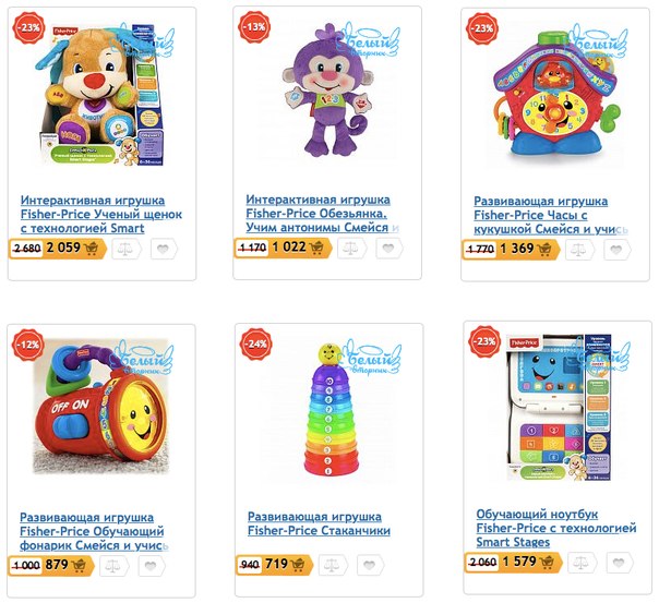 Выбирайте для малышей развивающие игрушки от Fisher-Price! Сейчас в интернет-магазине "Дочки-Сыночки" проходит распродажа, и у вас есть возможность купить игрушки с хорошими скидками.