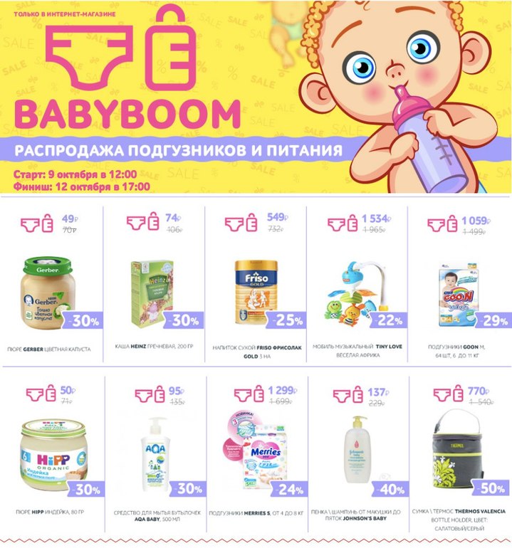 С 9 по 12 октября 2017 г. в интернет-магазине «Дочки-Сыночки» распродажа подгузников и детского питания BabyBoom!