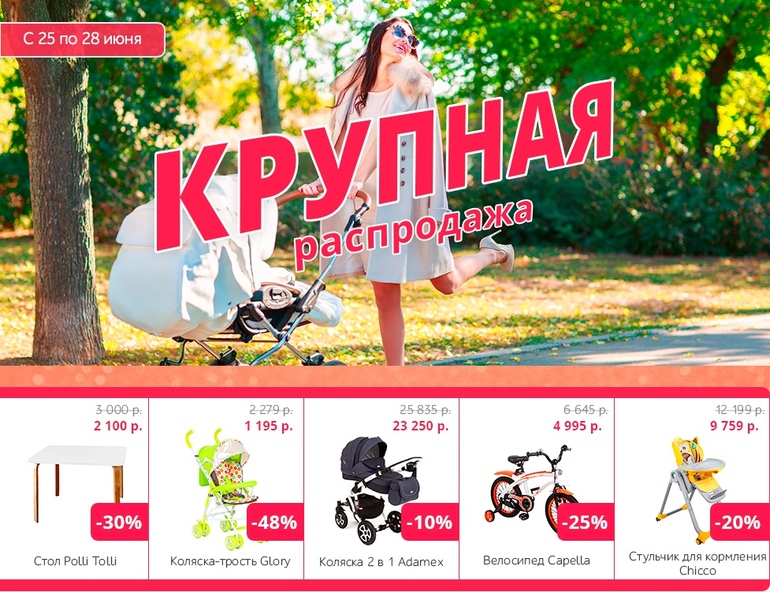 В нашей акции пополнение: всё, что нужно для летних прогулок со скидками до 30%. А также выгодные цены на детскую мебель и автокресла!