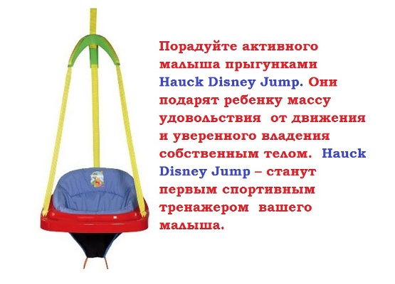 Чтобы развеять все сомнения по поводу пользы или вреда данного атрибута, отметим, что прыгунки помогают улучшить координацию движений, укрепить мышцы, тем самым обеспечить правильное развитие малыша. И совсем скоро, как только ваш сын или дочь освоится в новом для себя амплуа «прыгающего человечка», вы сможете спокойно пить кофе или смотреть телевизор в то время, пока ваш непоседа покоряет воздушное пространство квартиры.