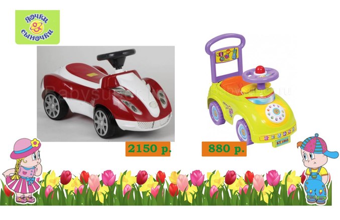 Для тех, кто считает, что первый автомобиль ребенка должен сразу стать блестящим идеалом, отличный вариант - . Ярко-красный кабриолет с фантастическими фарами, музыкальным сопровождением, удобным посадочным местом непременно порадует любого мальчугана. Ваш юный гонщик обязательно оценит внешний вид своего болида, покрутит руль, «побибикает» гудком и…отправится в свою первую поездку во двор или по квартире. Добавим лишь, что каталка удобна для ровных поверхностей, по бездорожью, к примеру, на даче ее не так легко перемещать.
