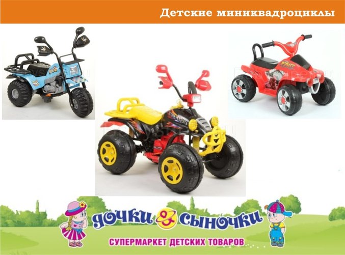 Дочки и сыночки спешат на помощьОни сегодня повсюду: эти маленькие жужжащие копии реальных автомобилей заполонили все парки, скверы, дворы и улицы. С наступлением жаркого сезона наши малыши из колясок перебрались в более интересный вид транспорта – За рулем этих мини-болидов и наши дети чувствуют себя взрослыми, пытаются управлять машиной и даже соблюдать правила дорожного движения (в данном случае – не давить пешеходов).
