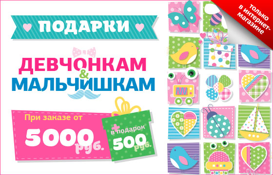 *Промокод на скидку будет предоставлен Вам в течение двух недель после оплаты заказа на e-mail или телефон. Промокод действителен при сумме следующего заказа от 2000 рублей. Промокод действует только в интернет-магазине «Дочки-Сыночки». Срок действия промокода: 1 месяц с даты получения.