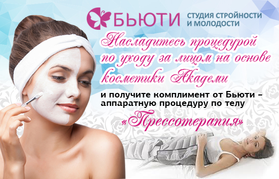 Насладитесь процедурой по уходу за лицом на основе косметики Академи и получите комплимент от Бьюти - аппаратную процедуру по телу "Прессотерапия": .